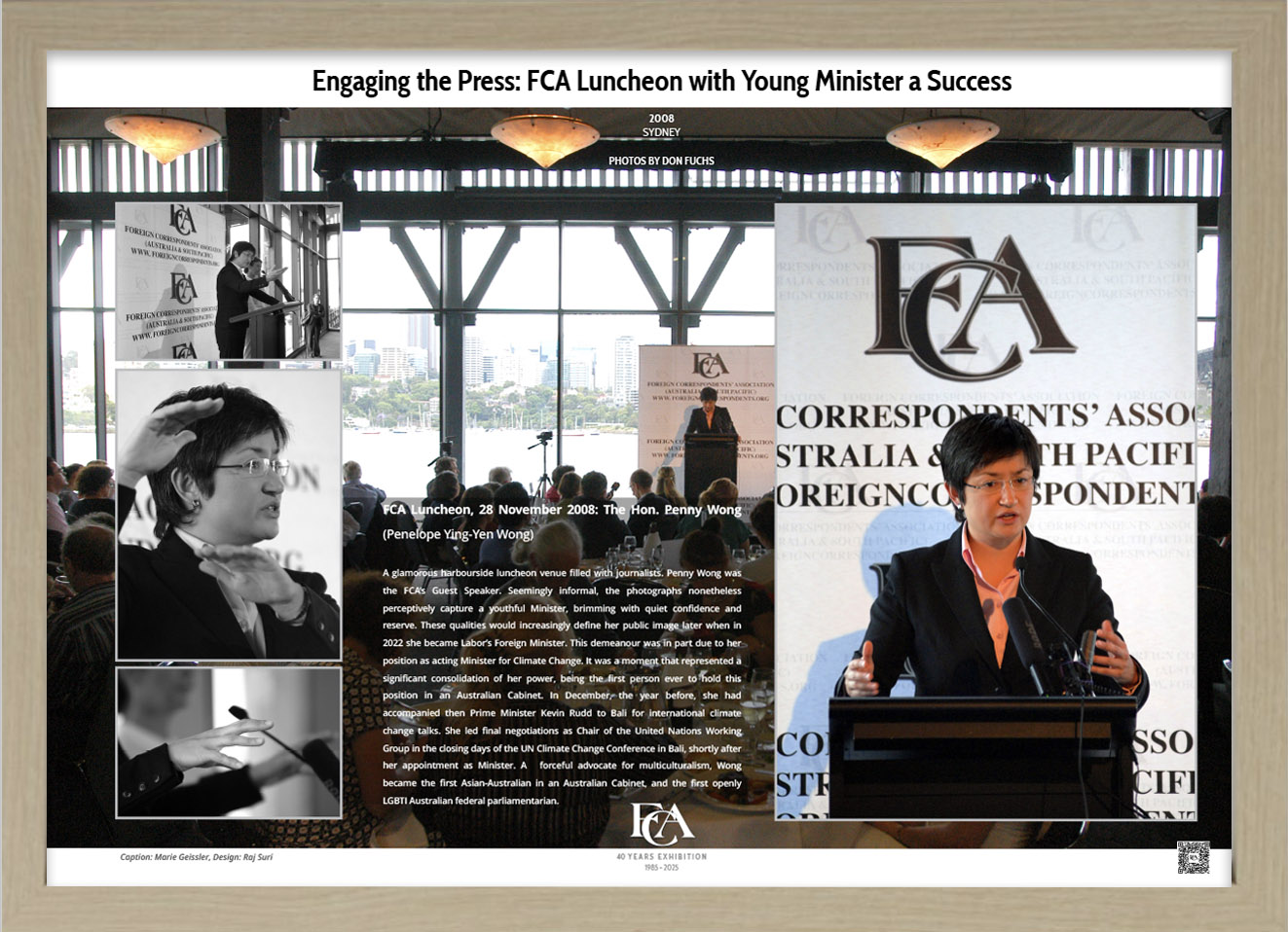 A glamorous harbourside luncheon venue filled with journalists. Penny Wong was the FCA’s Guest Speaker. Seemingly informal, the photographs nonetheless perceptively capture a youthful Minister, brimming with quiet confidence and reserve. These qualities would increasingly define her public image later when in 2022 she became Labor’s Foreign Minister. This demeanour was in part due to her position as acting Minister for Climate Change. It was a moment that represented a significant consolidation of her power, being the first person ever to hold this position in an Australian Cabinet. In December, the year before, she had accompanied then Prime Minister Kevin Rudd to Bali for international climate change talks. She led final negotiations as Chair of the United Nations Working Group in the closing days of the UN Climate Change Conference in Bali, shortly after her appointment as Minister. A forceful advocate for multiculturalism, Wong became the first Asian-Australian in an Australian Cabinet, and the first openly LGBTI Australian federal parliamentarian.