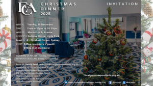 Founded in 1985, the FCA represents correspondents from international news organisations based in Australia and Australian journalists with extensive overseas experience or expertise in global affairs. Its membership of around 100 also includes professionals from diplomacy, academia, NGOs, and government. The Association hosts prominent political, business, and academic speakers, organises networking events, and promotes the role of foreign correspondents in Australia.